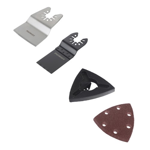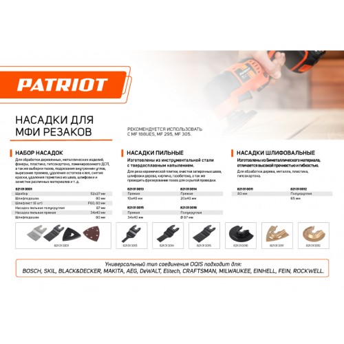 "Набор насадок для многофункционального резака применяется для обработки деревянных, металлических изделий, фанеры, пластика, гипсокартона, ламинированного ДСП, а также выборки пазов, подрезания внутренних углов, вырезание проемов, удаления остатков клея, снятия краски, удаления герметика из швов, шлифовки и зачистки различных материалов и т. д. Рекомендуем использовать с МФИ PATRIOT MF 188UES, MF 295, MF 305.