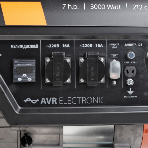 Генератор применяется в качестве аварийного или автономного источника электроэнергии для питания маломощных бытовых электроприборов и электроинструмента. Оптимальное соотношение мощности двигателя и электрогенератора обеспечивает стабильную работу на номинальной мощности. Оснащен двигателем с верхним расположением клапанов [OHV], что значительно увеличивает ресурс, снижает выхлоп и уровень шума. Надежный регулятор напряжения AVR и медная обмотка альтернатора позволяют выдерживать кратковременные 3х кратные перегрузки для использования с мощным электроинструментом. Датчик контроля масла исключает запуск и работу генератора при отсутствии или низком уровне масла в картере. Синхронный электрогенератор с системой автоматической регулировки и медными обмотками обеспечивает стабильное выходное напряжение и частоту тока. Цифровой электронный мультидисплей позволяет контролировать все выходные характеристики: напряжение, частоту, а счетчик моточасов помогает следить за интервалами между техническим обслуживанием. Выход 12 вольт позволяет подзарядить автомобильный аккумулятор в экстренном случае. Усиленная передняя панель с утопленными элементами управления снижает риск механических пов