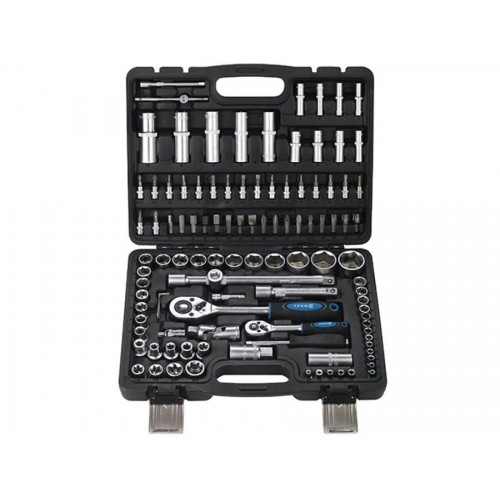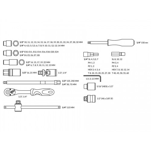 Универсальный набор головок и бит состоящий из 108 предметов. Посадочный размер - 14, 12 Торцевые головки 12 - 17 предметов: (10, 11, 12, 13, 14, 15, 16, 17, 18, 19, 20, 21, 22, 24, 27, 30, 32мм) Головка-звездочка 12 - 8 предметов: (10, 11, 12, 14, 16, 18, 20, 24мм) Глубокие торцевые головки 12 - 5 предметов: (14, 15, 17, 19, 22мм) Трещотка - 12 Удлинители 12 - 2 предмета (125, 250мм) Кардан - 12 Переходники Головки свечные 12 - 2 предмета: (16 мм, 21 мм) Шестигранные ключи - 3 предмета: (1.5, 2, 2.5) Биты 12 (насадки-отвертки) - 17 предметов: HEX: 7, 8, 10, 12, 14 SL: 8, 10, 12 PH: 3, 4 PZ: 3, 4 T: 40, 45, 50, 55, 60 Торцевые головки 14 - 13 предметов: (4, 4.5, 5, 5.5, 6, 7, 8, 9, 10, 11, 12, 13, 14мм) Головка-звездочка 14 - 5 предметов: (4, 5, 6, 7, 8мм) Глубокие торцевые головки 14 - 8 предметов: (6, 7, 8, 9, 10, 11, 12, 13мм) Трещотка - 14 Удлинители 14 -2 предмета (50, 75мм) Кардан - 14 Переходник Отвертка под биты - 14 Вороток - 14 Биты 14 (насадки-отвертки) - 17 предметов: HEX: 3, 4, 5, 6 SL: 4, 5.5, 6.5 PH: 1, 2 PZ: 1, 2 T: 8, 10, 15, 20, 25, 27, 30