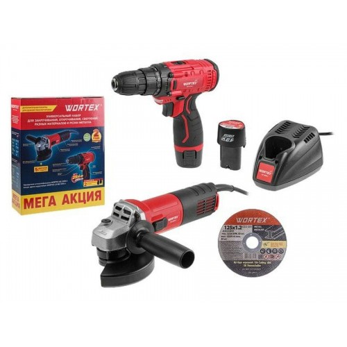 Набор электроинструмента WORTEX одноручная ушм + аккум. дрель-шуруповерт МЕГА АКЦИЯ в кор. (Ушм WORTEX AG 1209-3 + аккум. дрель-шуруповерт WORTEX LX BD 1215 Li, 2 АКБ, ЗУ, 5 дисков в подарок!)