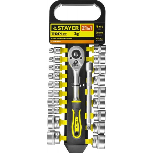 Набор инструментов торцовые головки STAYER 27752-H21, предназначен для монтажа и демонтажа резьбовых соединений при ремонте автомобилей и других изделий. Хромированное покрытие. Hi-Q сталь. Профиль FLANK для быстрого и точного захвата крепежа.