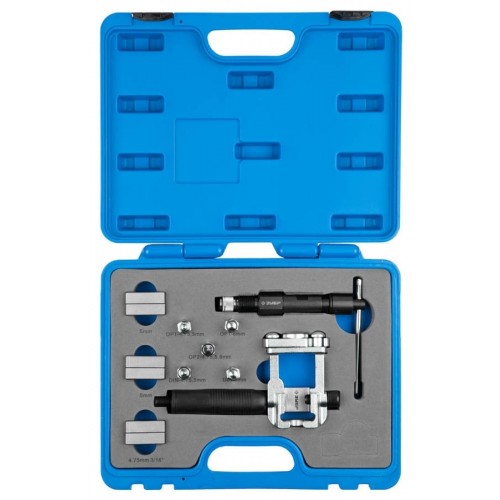 Развальцовка для труб ЗУБР 23613-H10, применяется для изготовления точных простых и двойных бортиков с углом 90 и 115 градусов на медных, алюминиевых и тонкостенных стальных трубах, трубах с двойными стенками (тип BUNDY®) и трубок тормозных систем из KUNIFER с толщиной стенки 0,7 и 1мм. Имеет большой ресурс и обеспечивает высокое качество выполнения работ. Изготовлена из высококачественной инструментальной стали. Горизонтальный зажим трубы, облегчает работу с длинными трубопроводами. Быстрая смена насадок и головок. Удобный пластиковый кейс для хранения и переноски.