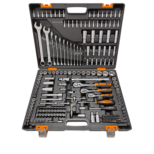 Набор инструментов 216 предметов отлично подойдет для ремонта авто в сервисе и домашних условиях. Набор инструментов упакован в пластиковый кейс и состоит из предметов с присоединительным размером 3/8", 1/2" и 1/4" предназначенных для монтажа и демонтажа резьбового крепежа с разными типами шлицев.