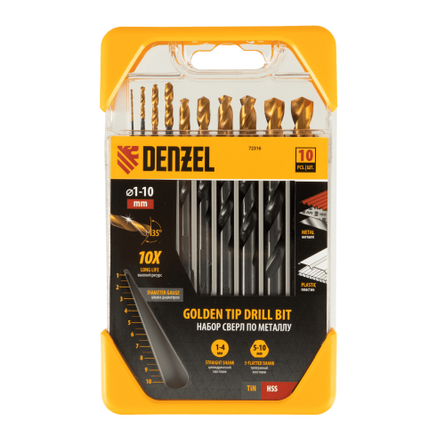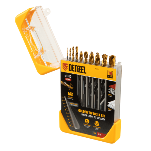 Набор сверл по металлу DENZEL 1-10 мм, HSS-Tin, Golden Tip, 10 шт
