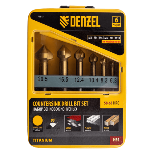 Набор зенковок DENZEL HSS, M3-M10, 6 шт, металл. кейс
