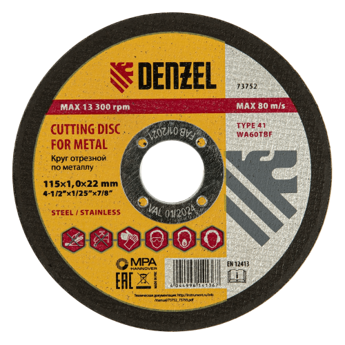 Круг отрезной по металлу DENZEL 73752, 115 x 1 x 22.2 мм