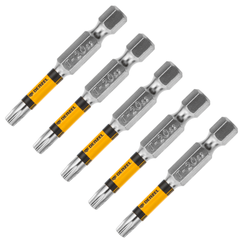 Набор бит Denzel 7711320 типоразмера T20 x 50, 5 шт. в упаковке, подходит для использования с шуруповертами, электрическими отвертками и отвертками-держателями. Используется для сборки и ремонта бытовой техники и электроприборов. Будет полезен в мастерской, пригодится также дома, в гараже и на даче.