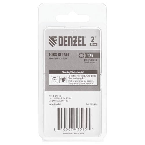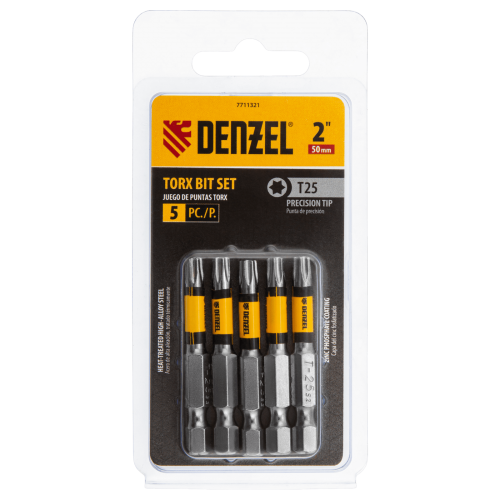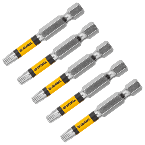 Набор бит Denzel 7711321 типоразмера T25 x 50, 5 шт. в упаковке, подходит для использования с шуруповертами, электрическими отвертками и отвертками-держателями. Используется для сборки и ремонта бытовой техники и электроприборов. Будет полезен в мастерской, пригодится также дома, в гараже и на даче.