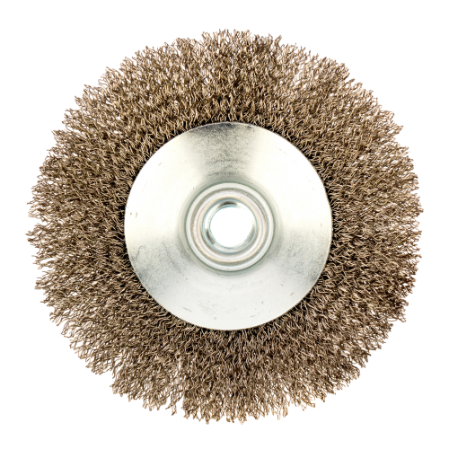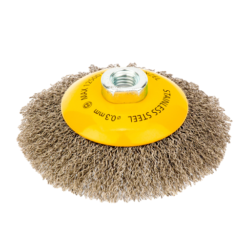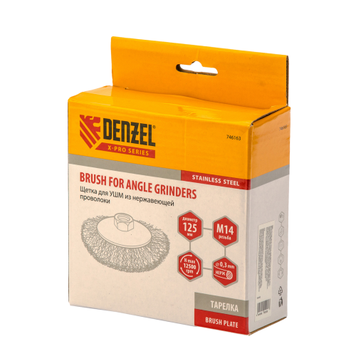 Щетка для УШМ «Тарелка» Denzel 746163, М14, диаметром 125 мм, с щетиной из витой нержавеющей проволоки 0,3 мм, используется для щадящей обработки металлических, в том числе нержавеющих, а также деревянных и пластиковых поверхностей. Постепенно снимает тонкий слой ржавчины, старого лака или краски, удаляет загрязнения. Подходит для придания поверхности заданной шероховатости или подчеркивания структуры дерева. Тарельчатая форма щетки оптимальна для обработки как плоскостей, так и труднодоступных мест. Щетку устанавливают на вал углошлифовальной машины (УШМ), поддерживающей работу со скоростью до 12500 об/мин. Обязательно использование защитных очков, респиратора, перчаток, наушников, спецодежды и обуви. Щетка предназначена для выполнения профессиональных и бытовых работ.
