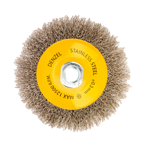 Щетка для УШМ DENZEL 746163, 125 мм, «тарелка», витая нержавеющая проволока 0.3 мм, М14