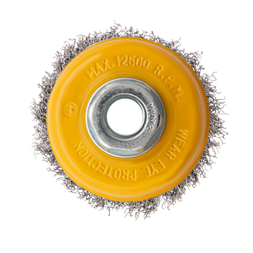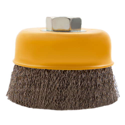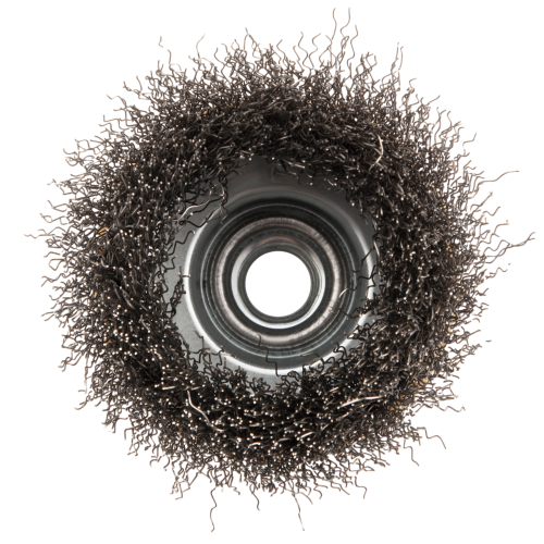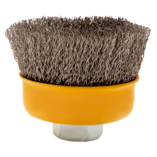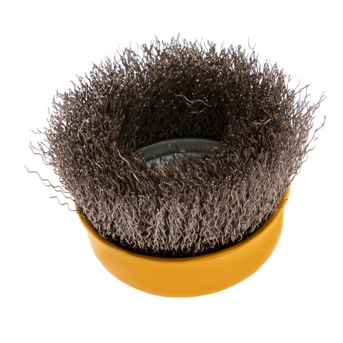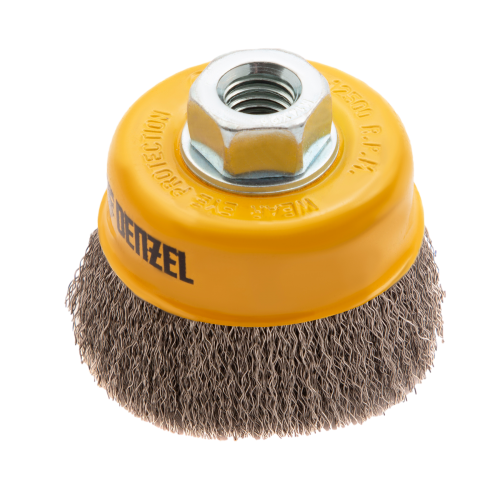 Щетка для УШМ «Чашка» Denzel 746043, М14, диаметром 75 мм, с щетиной из витой нержавеющей проволоки диаметром 0,3 мм, позволяет быстро и аккуратно очистить металлическую, деревянную или пластиковую поверхность от незначительных загрязнений и ржавчины, а также удалить остатки лакокрасочных материалов, сделать поверхность шероховатой или матовой. Насадка подходит для очистки плоских участков большой площади. Поскольку щетина выполнена из нержавеющей стали, щетку можно использовать для обработки изделий из нержавейки. Щетка устанавливается на вал углошлифовальной машины (УШМ) и предназначена для работы с максимальной скоростью 12500 об/мин. Во время работы обязательно соблюдение техники безопасности и использование средств индивидуальной защиты. Щетку применяют в строительстве, на производстве, а также в быту.