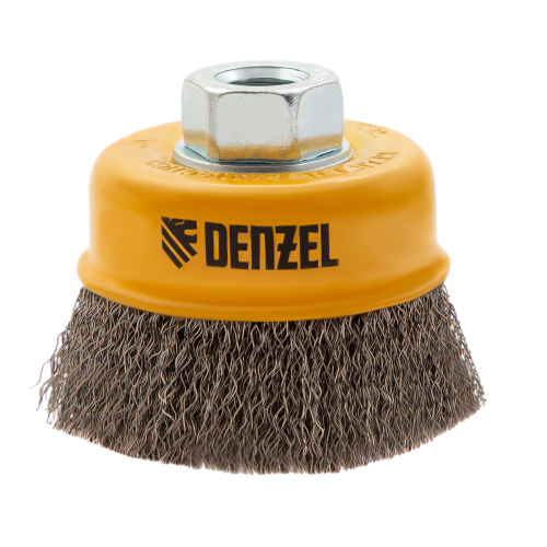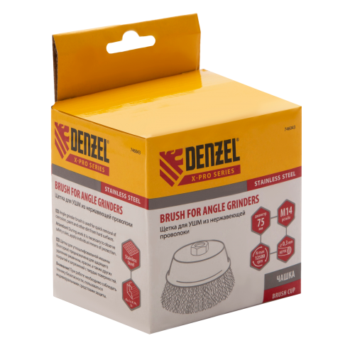 Щетка для УШМ DENZEL 746043, 75 мм, «чашка», витая нержавеющая проволока 0.3 мм, М14