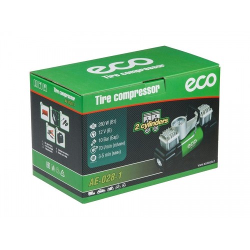 Компрессор автомобильный ECO AE-028-1 (70л/мин, 10bar, 280Вт, 12В) (12В, 280Вт, 10bar, 70л/мин, 2 цилиндра, фонарь, сумка)