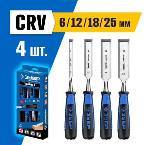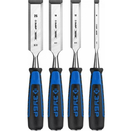 Набор стамесок ЗУБР 18097-H4, предназначен для выборки гнезд, пазов и отверстий в древесине, строгания, подрезки плоскостей и выступов, обработки криволинейных поверхностей, зачистки кромок и торцов, снятия фасок, неглубокого долбления. Стальной затыльник для предотвращения разрушения ручки при ударе. Лезвие закалено до твердости HRC 60–65 на 2/3 своей длины. Превышает требования ГОСТ 1185-80 по качеству. Изготовлены из высококачественной CrV стали. Эффективная заточка лезвия весь срок службы.
