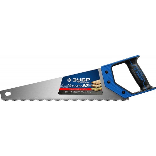 Ножовка универсальная МОЛНИЯ 3D ЗУБР 15077-40_z01, применяется для точного продольного и поперечного распила средних заготовок всех видов материалов. Двухкомпонентная эргономичная рукоятка. Жесткое утолщенное полотно из высококачественной стали У8А для идеально прямого реза. Импульсная закалка каждого зуба: высокая твердость и предотвращение выкрашивания.