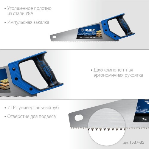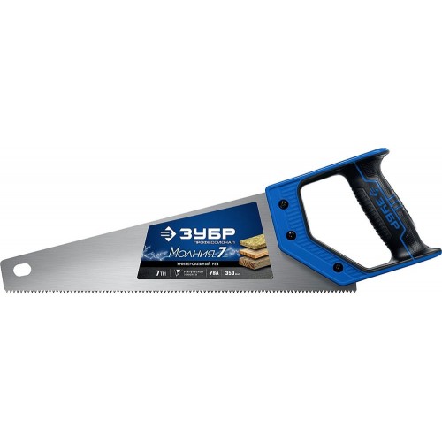 Ножовка универсальная (пила) МОЛНИЯ 7 ЗУБР 1537-35_z02, применяется для продольного и поперечного распила древесины, средних заготовок, фанеры, ДСП, МДФ. Двухкомпонентная эргономичная рукоятка. Импульсная закалка каждого зуба: высокая твердость и предотвращение выкрашивания. Утолщенное полотно из высококачественной стали У8А для идеально прямого реза.
