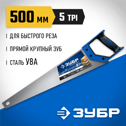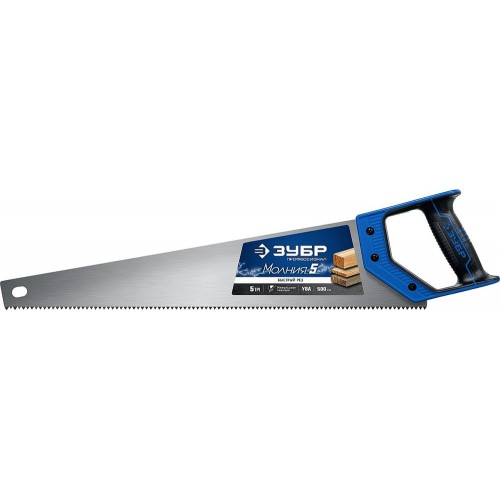 Ножовка по дереву (пила) МОЛНИЯ 5 15075-50_z02, применяется для поперечного распила крупных и средних заготовок мягкой и твердой древесины. Двухкомпонентная эргономичная рукоятка. Импульсная закалка каждого зуба: высокая твердость и предотвращение выкрашивания. Утолщенное полотно из высококачественной стали У8А для идеально прямого реза.