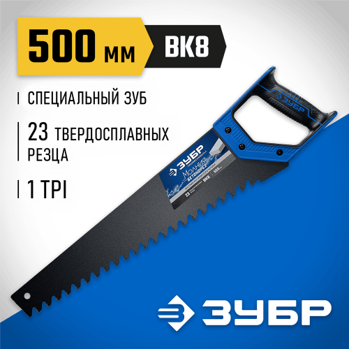Ножовка по пенобетону ЗУБР 15157-50, предназначена для ручной распилки блоков из пенобетона. Специальный зуб с твердосплавными напайками увеличивает скорость выполнения работ и обеспечивает длительный срок службы. Двухкомпонентная рукоятка эргономичной формы из ударопрочной пластмассы и мягкого полимера снижает утомляемость при работе и обеспечивает комфортное пиление. Надежный и качественный инструмент, незаменимый помощник при распилочных работах.