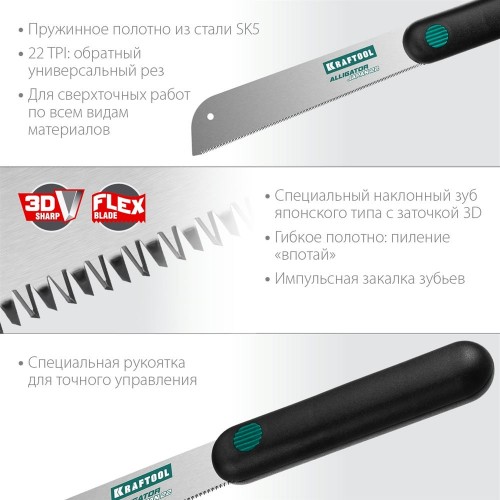 Ножовка по дереву для сверхточных работ KRAFTOOL 1-15194-18-22, предназначена для продольной и поперечной распиловки древесины различных пород средних и мелких размеров, ДСП. Специальный наклонный зуб японского типа с заточкой 3D. Импульсная закалка зубьев: высокая твердость и долговечность. Пружинное полотно из японской стали SK5 толщиной 0,3 мм. Идеальный пропил. Специальная рукоятка для точного управления.