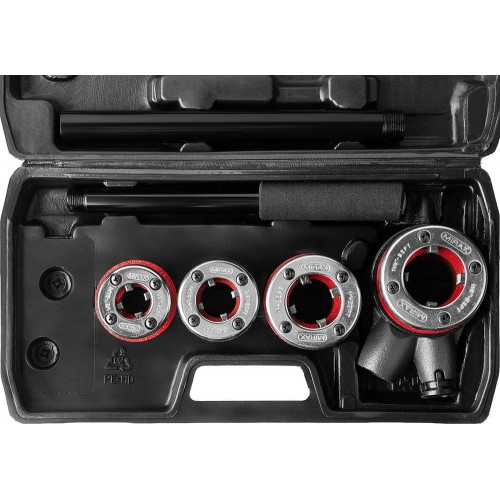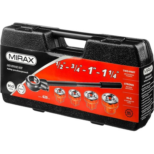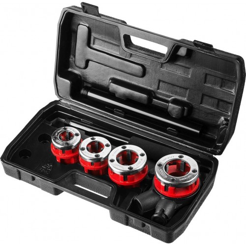 Набор резьбонарезной трубный MIRAX 28240-H4, предназначен для нарезания трубной конической резьбы. Набор включает в себя популярные размеры клуппов для нарезания резьбы на металлических трубах. Качественные резцы из стали 9Cr2 для ровного реза резьбы. Удобный пластиковый кейс для хранения и транспортировки. Двухкомпонентная ручка трещотки с реверсом для удобства в использовании.