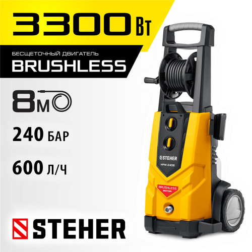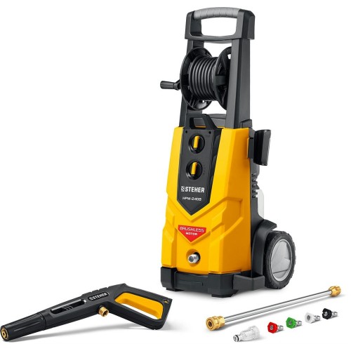 Мойка высокого давления STEHER HPW-240B, предназначена для образования струи воды высокого давления, используемой для мойки автомобилей, велосипедов и другой колесной техники, садового инвентаря, наружных стен и уличных покрытий. Бесщеточный двигатель. Функция самовсасывания позволяет использовать изделие без внешнего источника давления воды. Система полной остановки выключает двигатель при отпускании клавиши пистолета, что экономит энергию и увеличивает ресурс помпы. Высокая мощность выходной струи для эффективной мойки. Шланг длиной 8 м позволяет производить обработку без необходимости перемещать мойку. Барабан для предохранения шланга от перегибов при использовании и хранении и продления срока его службы. Сменные быстросъемные насадки с различными углами распыления для формирования струи различного давления, а также нанесения моющего средства. Прилагаемый фильтр на вход для защиты помпы от загрязнений в воде. Встроенный бачок для моющего средства для предварительной обработки пенным составом.
