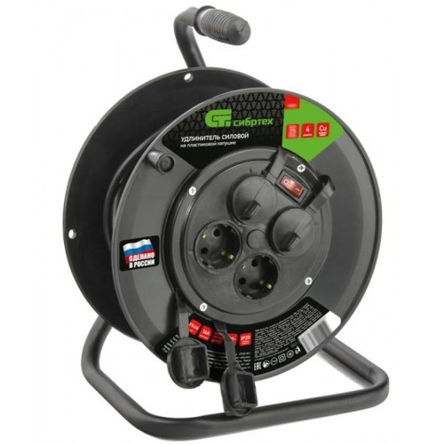 Удлинитель силовой на кабельной катушке, ПВС, 25 м, 4 розетки с крышкой, IP44, 16А, УХз16 СИБРТЕХ 96047