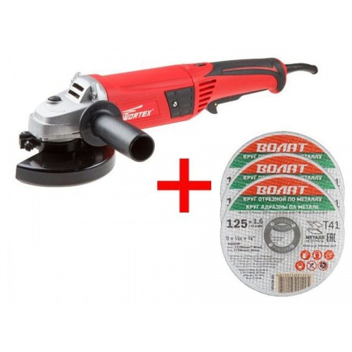Одноручная углошлифмашина WORTEX AG 1213 в кор.+ АКЦИЯ! (3 отрезных круга ВОЛАТ в подарок!)