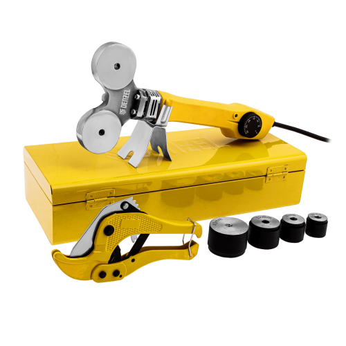 - Широкий комплект поставки — к аппарату прилагаются 4 насадки для соединения труб диаметром 20, 25, 32 и 40 мм, имбусовый ключ и труборез.