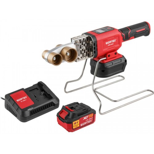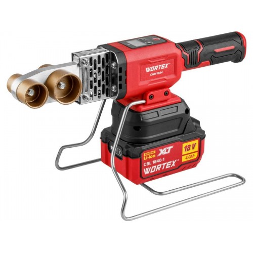 Аккум. сварочный аппарат для полимерных труб WORTEX CWM 1834 ALL1 XLT SET с акб и зу+3 насадки (300 Вт, 25-340 C, электронная регулировка.)
