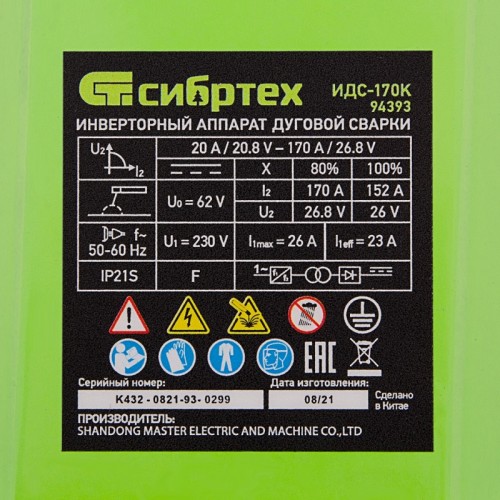 Инверторный аппарат дуговой сварки ИДС-170K, 170 А, ПВ 80%, диаметр электрода 1,6-3,2 мм СИБРТЕХ 94393