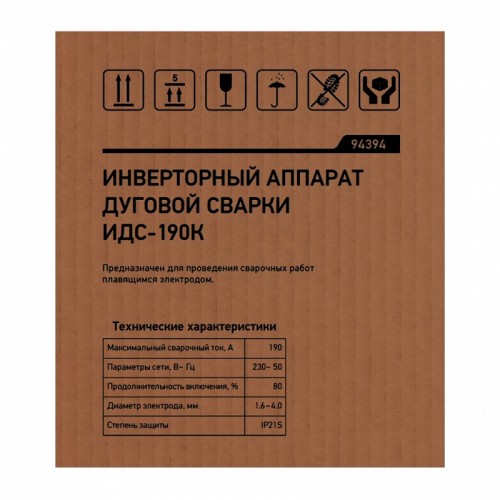 Инверторный аппарат дуговой сварки ИДС-190K, 190 А, ПВ 80%, диаметр электрода 1,6-4 мм СИБРТЕХ 94394