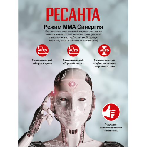 В режиме Синергии ММА, в зависимости от выбранного диаметра электрода и толщины металла, сила сварочного тока находится в оптимальном диапазоне, функции «форсаж дуги» и «горячий старт» подстраиваются автоматически.