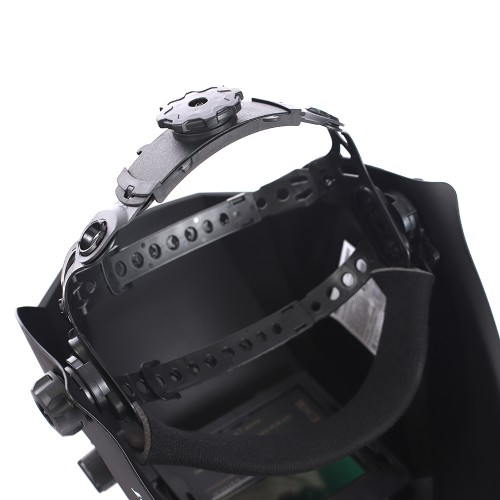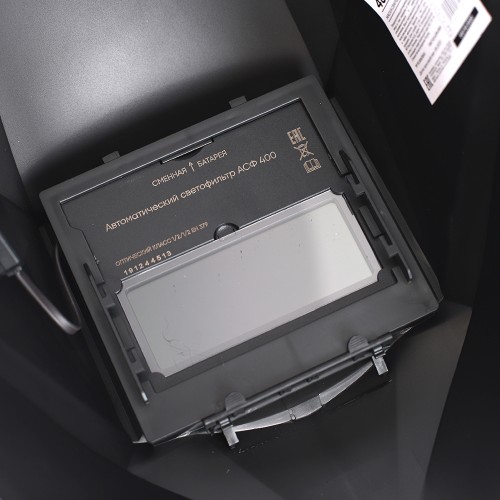 Изготовлена из высокопрочного пластика. В щитке предусмотрен современный самозатемняющийся светофильтр с дополнительным регулятором затемнения 9-13 DIN. Фильтр дополнительно защищен поликарбонатным стеклом. Для удобства оголовье легко подстраивается под размер головы, имеются 4 вида регулировки.