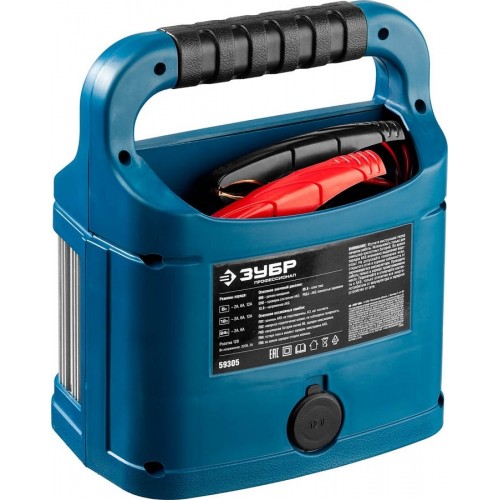 Зарядное устройство ЗУБР 59305, предназначено для зарядки аккумуляторных батарей легковых и грузовых автомобилей, мотоциклов и т.д. с напряжением 6, 12 и 24 В. Тип заряжаемых аккумуляторов: WET/GEL/AGM. Устройство является полностью автоматическим. Прочный корпус зарядного устройства защищает внутренние элементы от случайных повреждений. На лицевой панели устройства предусмотрены цифровой дисплей, который отображает рабочие параметры, и индикаторы, которые сигнализируют о ходе процесса зарядки. Устройство имеет 9 режима работы, включая режим зимнего использования и 9 этапов процесса зарядки, а также функция поддержания АКБ в заряженном состоянии - режим хранения. Имеется встроенная розетка на 12 В. Специальные зажимы обеспечивают быстрое подключение и надежность контактов (без потерь). Зарядное устройство обладает высокой эффективностью и имеет защиту от ошибок, перегрева и короткого замыкания. Есть функция памяти.