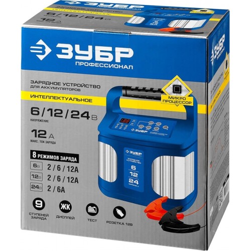 ЗУБР 6в/12в/24в, 12а, автомат (9 режимов заряда), IP65, интеллектуальное зарядное устройство 59305 Профессионал