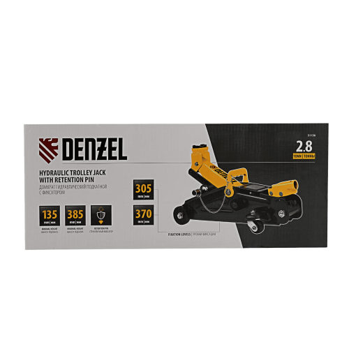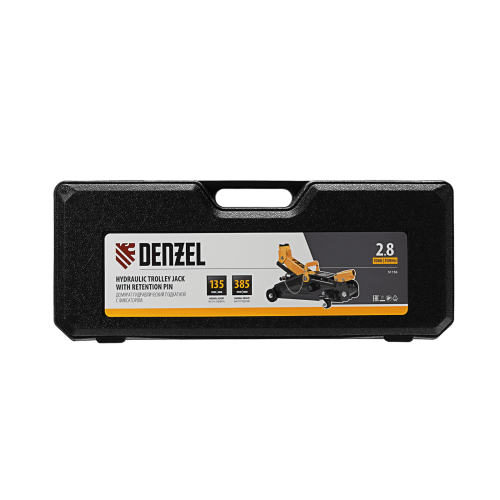 Домкрат гидравлический DENZEL подкатной с фиксатором, 2,8 т, 135-385 мм, в кейсе