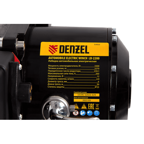 Лебедка автомобильная электрическая DENZEL LB- 2200, 2,2 т, 3,3 кВт, 12 В