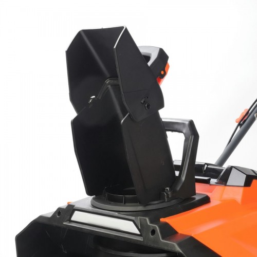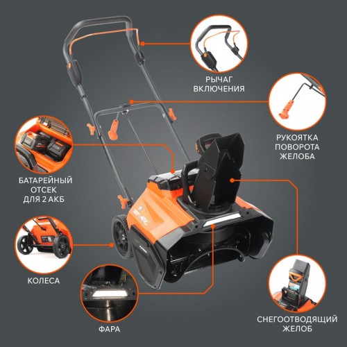Одноступенчатый резино-металлический шнек (диаметр 17 см) и удобный ковш (ширина 50 см). В передней части снегоуборщика расположены две светодиодные фары. Колеса диаметром 19 см эффективны для эксплуатации на ровных поверхностях. Небольшие габариты и малый вес (23 кг). Дальность выброса снега до 6 метров.