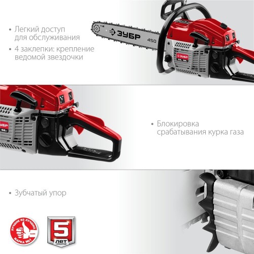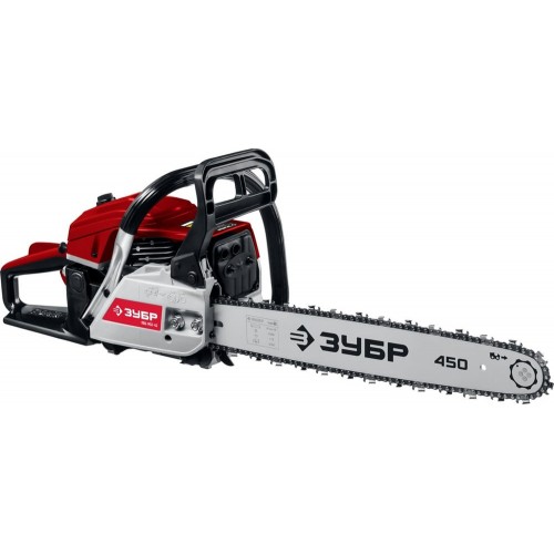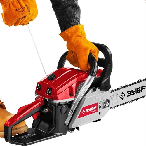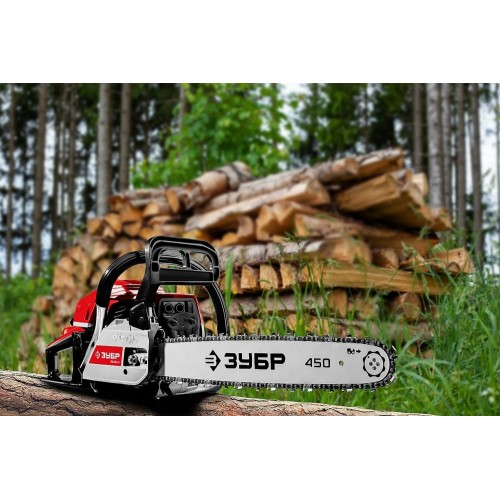Идеальный вариант для пиления досок, бруса, стволов различных пород дерева на дачном участке. В отличие от электрической, бензиновая пила оснащена более мощным двигателем, безопасна в отношении поражения электрическим током, может работать в любую погоду и в любом месте. Функции легкого запуска, автоматической смазки цепи и эффективная антивибрационная защита делают пилу легкой в обращении и комфортной в работе. Двойной тормоз цепи, приводимый в действие при откидывании защитного щитка или при отпускании клавиши блокировки на рукоятке, а также встроенный цепеуловитель и металлический упор делают пилу безопасной в применении. Большая удельная мощность, высокое качество применяемых материалов и изготовления, обеспечивающие увеличенный ресурс, делают бензиновую пилу ЗУБР Вашим лучшим помощником. Обратите внимание, что рекомендуемая пильная гарнитура ЗУБР устанавливается только комплектом