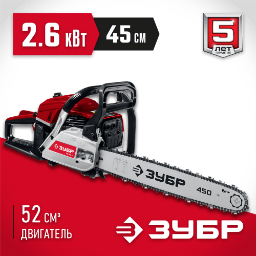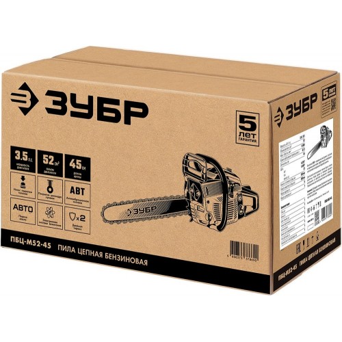 ЗУБР 2.6 кВт/3.5 л.с, 450 мм, пила цепная бензиновая ПБЦ-М52-45 Мастер