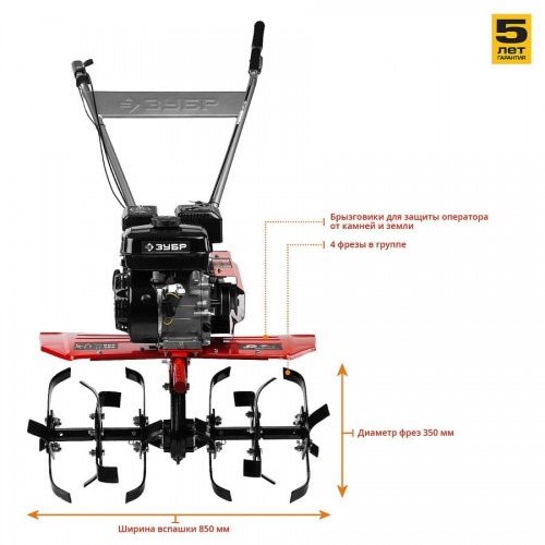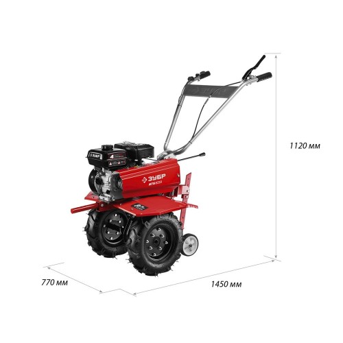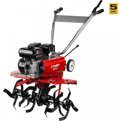 Мотоблок ЗУБР МТБ-300, предназначен для рыхления и культивации почвы на приусадебном участке. Кронштейн для крепления навесного оборудования и шкив отбора мощности позволяют использовать широкую гамму навесного оборудования: снегоуборщик, щетку, роторную косилку. 2 скорости вперед (основная и повышающая) и 1 назад позволяют комфортно работать на любых типах почвы. Сошник объединен с транспортировочными колесами для удобства перемещения до места работы не повреждая при этом газон или тротуарную плитку ножами. Cамозатачивающиеся закаленные фрезы из конструкционной стали. Универсальная сцепка позволяет использовать различное навесное оборудование. Рукоять мотоблока с возможностью регулировки по вертикали делает управление более комфортным. Защитный кожух ограничивает доступ к вращающимся частям клиноременной передачи и обеспечивает безопасность. Закаленные фрезы прекрасно закапываются на полную глубину и способствуют продвижению мотоблока вперед. Большие пневматические колеса обеспечивают отличную проходимость.