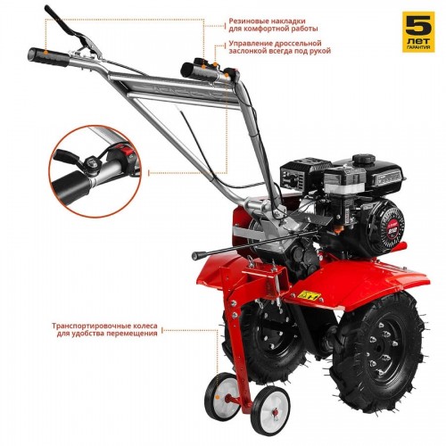 Надёжный и манёвренный мотоблок для рыхления и культивации почвы на приусадебном участке. Складываемые, регулируемые по положению рукоятки и транспортное колесо облегчают эксплуатацию, транспортировку и хранение.