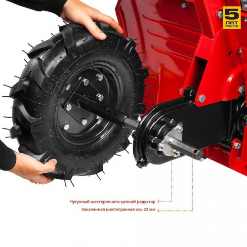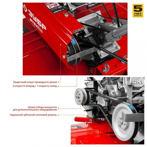 - 2 скорости вперед (основная и повышающая) и 1 назад позволяют комфортно работать на любых типах почвы