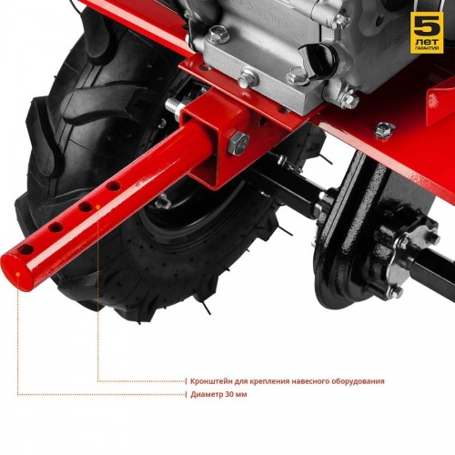 - Кронштейн для крепления навесного оборудования (диаметр 30 мм) и шкив отбора мощности позволяют использовать широкую гамму навесного оборудования: снегоуборщик, щетку, роторную косилку