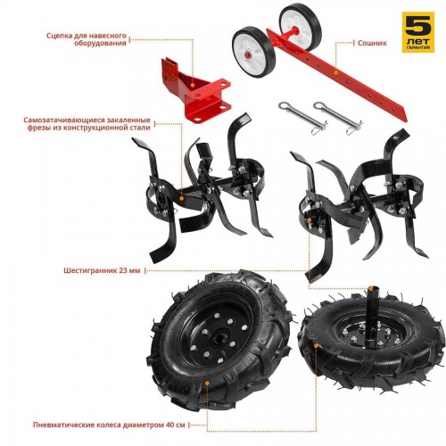 - Конструкция мотоблока позволяет использовать его с различными навесными оборудованием