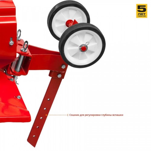 - Регулируемый сошник надежно фиксируется к раме культиватора и отвечает за регулировку глубины вспашки