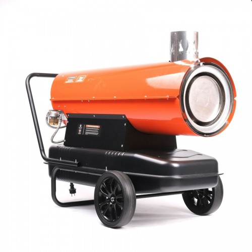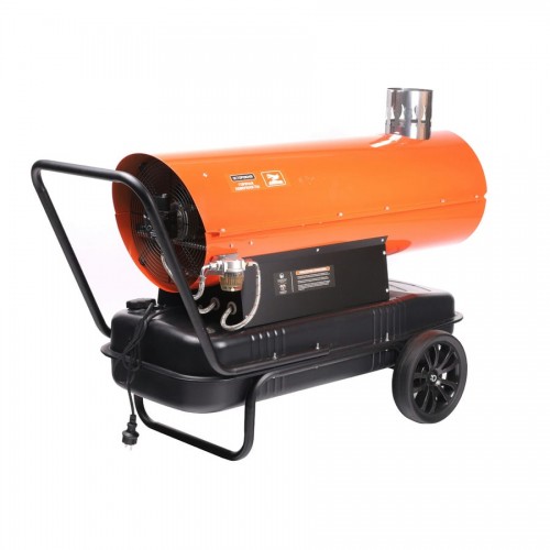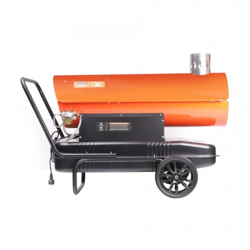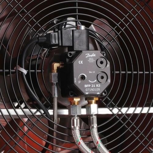 Тепловая пушка оборудована топливным баком объемом 68 литров, что обеспечивает продолжительную работу до 14 часов без дозаправки. Калорифер работает на дизельном топливе. От электрической сети напряжением 220-230 В работает только вентилятор, насос для топлива и дисплеи.
