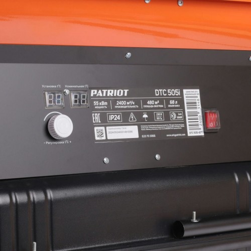 Тепловая пушка дизельная PATRIOT DTС 505i с производительностью до 1100 м³/час для обогрева больших помещений площадью до 550 м². Тепловой мощности 55 кВт хватит для монтажа натяжных потолков из ПВХ, сушки штукатурки и шпаклевки, прогрева свежеокрашенных фасадов. Электронный термостат поддерживает заданную температуру в автоматическом режиме.