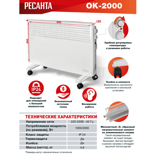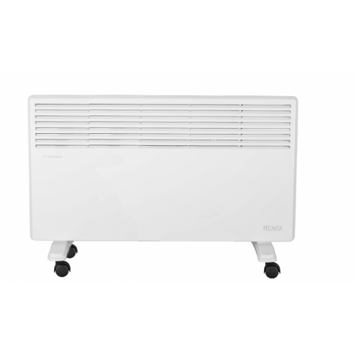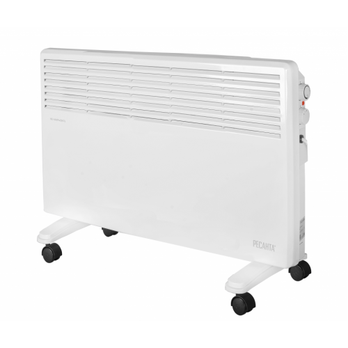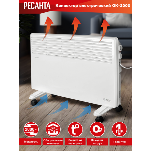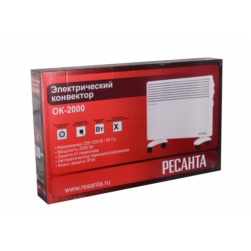 Электрический конвектор РЕСАНТА ОК-2000 для обогрева помещений. Состоит из нагревательной части (ТЭН), заключенной в нижней части корпуса со щелеобразными отверстиями снизу и жалюзи в верхней части. Данная конструкция даёт возможность воздуху беспрепятственно проходить внутри конвектора,