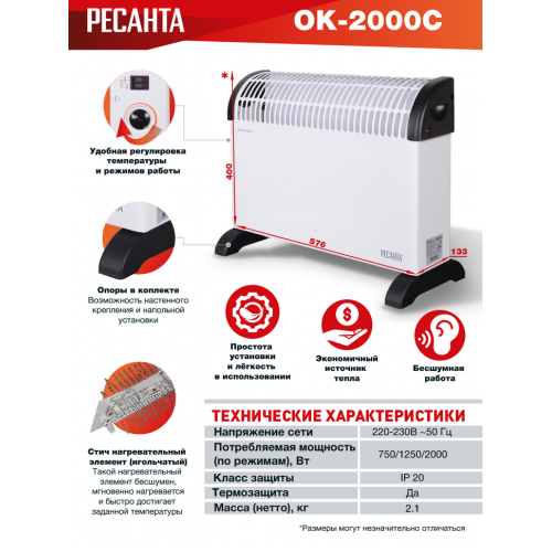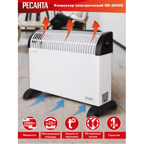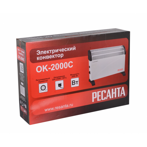 Электрический конвектор РЕСАНТА ОК-2000С для обогрева помещений. Состоит из нагревательной части (СТИЧ), заключенной в нижней части корпуса со щелеобразными отверстиями снизу и жалюзи в верхней части. Данная конструкция даёт возможность воздуху беспрепятственно проходить внутри конвектора,